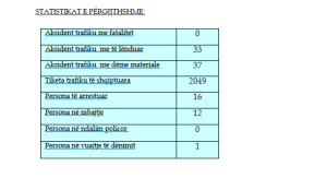 Aty shtohet edhe se gjatë kësaj kohe janë raportuar 37 aksidente trafiku me dëme materiale, dhe, 33 me të lënduar.